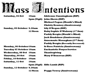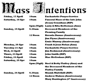 Sunday Mass will be celebrated on Saturday with Vigil Mass at 6pm and on Sunday with Masses at 09.30am and 12 noon.