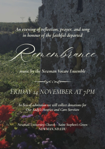 Remembrance is on Friday, November 14, at 7pm in University Church. An evening of prayer, reflection, and song in honour of the faithful departed. In lieu of admission we will be collecting donations for Our Lady’s Hospice & Care Services after the service.